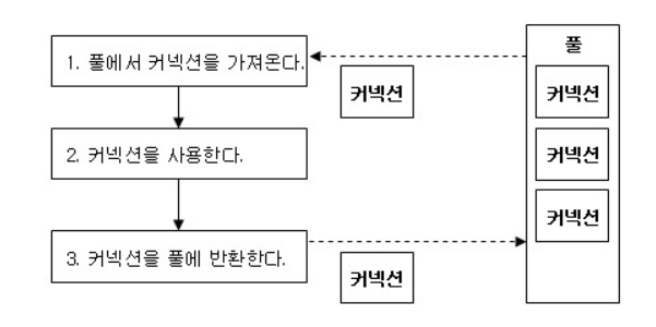 위의 그림처럼 풀(Pool) 속에 데이터 베이스와의 연결들을 미리 만들어 두고