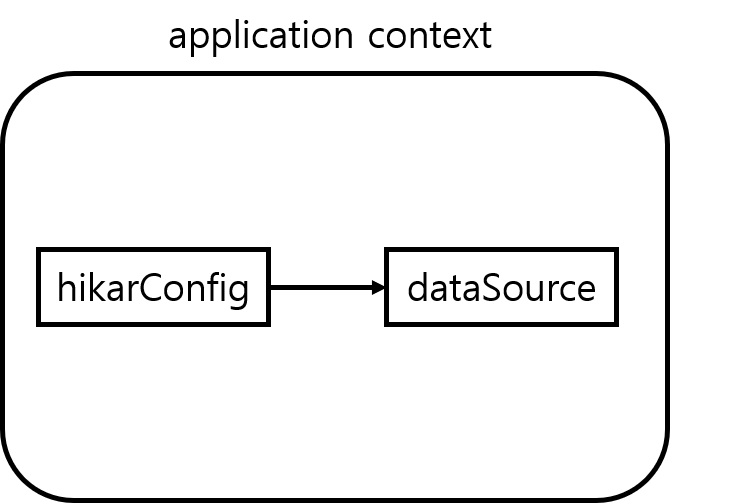 12345678910111213<bean id="hikariConfig" class="com.zaxxer.hikari.HikariConfig"><property name="driverClassName"value="oracle.jdbc.driver.OracleDriver"></property><property name="jdbcUrl"value="jdbc:oracle:thin:@localhost:1521:XE"></property><property name="username" value="username"></property><property name="password" value="password"></property></bean><bean id="dataSource" class="com.zaxxer.hikari.HikariDataSource"destroy-method="close"><constructor-arg ref="hikariConfig"/></bean>cs 그러면 스프링에 application context에는 다음 그림처럼 빈이 등록된다.