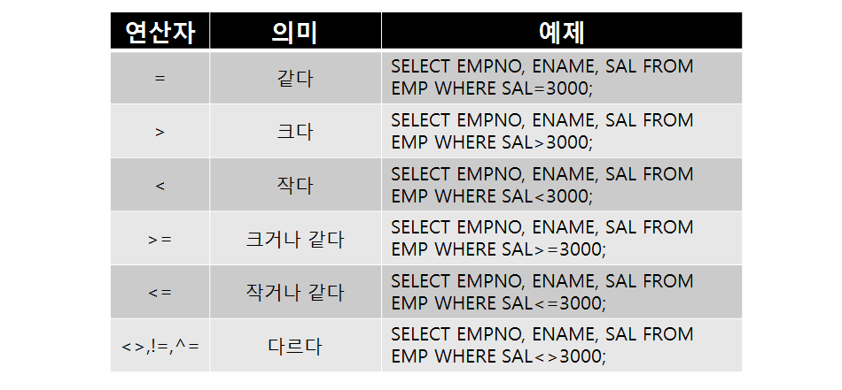 ex) SELECT * FROM EMP WHERE SAL > 3000;