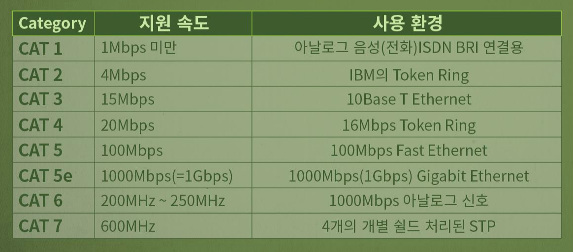 -CAT3는 10Mbps이내로, CAT5는 100Mbps이내의 속도로 운영되도록 규정