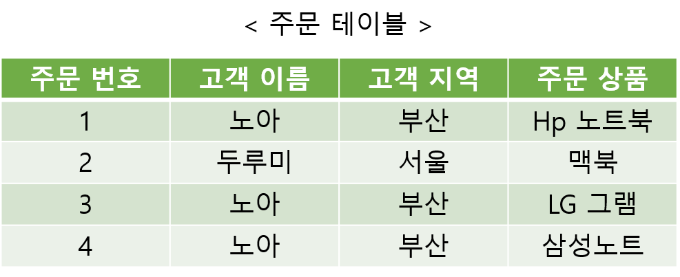 특정 고객이 여러 상품을 구매하는 경우 고객 이름과 고객 지역 데이터가 계속 해서 중복된다.