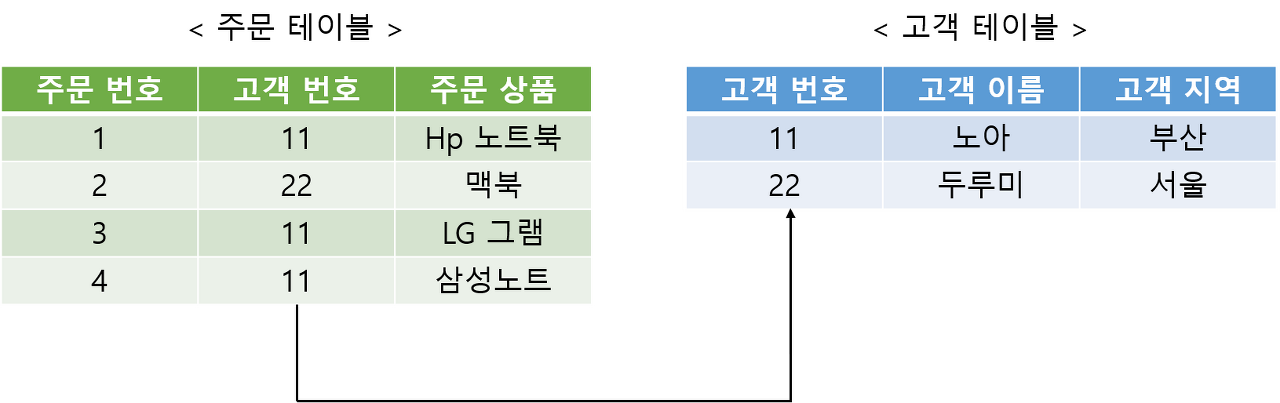 그림과 같이 테이블 간의 관계는 기본 키 (Primary key) 와 외래 키 (Foreign key) 라는 개념을
