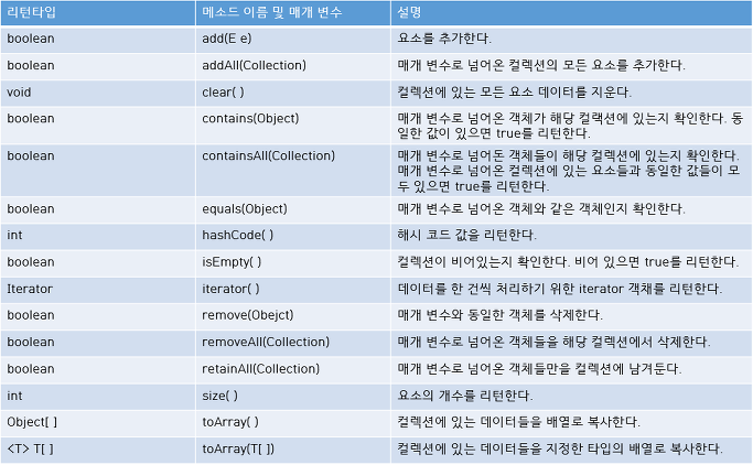 Collection 인터페이스에 선언된 주요 메소드